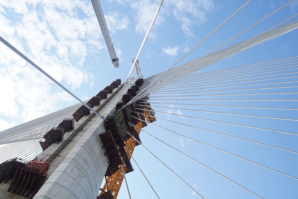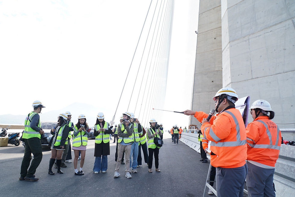 國內重要地標工程淡江大橋即將於115年5月完工通車,在114年9月16日正式合龍,橋體全線貫通後,為了完善整體橋梁結構安全,提升行車舒適度,淡江大橋刻正進行,包含斜索阻尼、景觀燈柱的安裝及高性能GUSS瀝青的鋪設等作業。